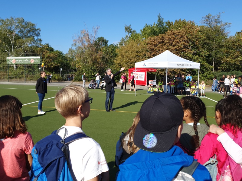 Los ging es gegen 9 Uhr mit einem gemeinsamen Warm-Up – und einer schwungvollen Begrüßung aller Teilnehmerinnen und Teilnehmer durch Bezirksbürgermeister Helmut Kleebank: „Ein großes Lob an alle Organisatorinnen und Organisatoren und ein herzliches Danke an alle Lehrerinnen und Lehrer, die heute mit ihren Schulklassen hier zusammengekommen sind, um gemeinsam ein tolles Sportfest zu erleben. Wir würden uns wünschen, dass das „Interkulturelle Sportfest“ des Landessportbund Berlin künftig ein fester Programmpunkt im Spandauer Veranstaltungskalender wird.“