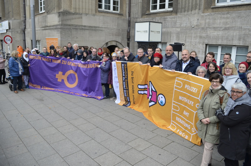 Bezirksbürgermeister Helmut Kleebank und die Frauenbeauftragte des Bezirks Juliane Fischer-Rosendahl haben heute mit der Unterstützung des Bezirksamts, des Frauenbeirats, Vertretern von verschiedenen Fraueninitiativen, Beschäftigten des Bezirksamts und vielen anderen Interessierten gemeinsam die Flagge zum internationalen Tag gegen Gewalt an Frauen gehisst und damit ein Zeichen ihrer Solidarität gesetzt.