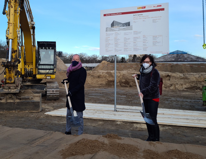 Auch wenn der Präsenzunterricht der Schulen derzeit fast überall in Deutschland ruht, gehen die Bauarbeiten an der Berliner Schulbauoffensive – dem größten Investitionsvorhaben des Landes – weiter. So auch in Spandau. Hier wurde am 21. Januar der Bau der Heinrich-Böll-Oberschule, inklusive Außenanlagen, mit dem symbolischen ersten Spatenstich durch Hermann-Josef Pohlmann, Leiter der Hochbauabteilung der Senatsverwaltung für Stadtentwicklung und Wohnen, und Birgit Faak, Schulleiterin der Heinrich-Böll-Oberschule, offiziell begonnen.