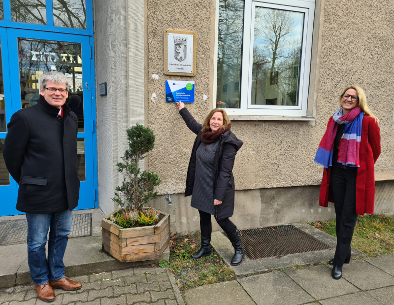 Um die Programmteilnahme auch nach außen hin sichtbar zu machen, wurde am Mittwoch ein entsprechendes Info-Schild am Gebäude der Schule enthüllt. Der Termin fand in kleiner Runde und unter Wahrung der Abstands- und Hygieneregeln statt. Auch Bezirksbürgermeister und Bildungsstadtrat Helmut Kleebank ließ sich einen kurzen Besuch nicht nehmen: „Es freut mich wirklich sehr zu sehen, mit wie viel Engagement sich die Schulgemeinschaft der Bernd-Ryke-Grundschule in das Projekt einbringt.“