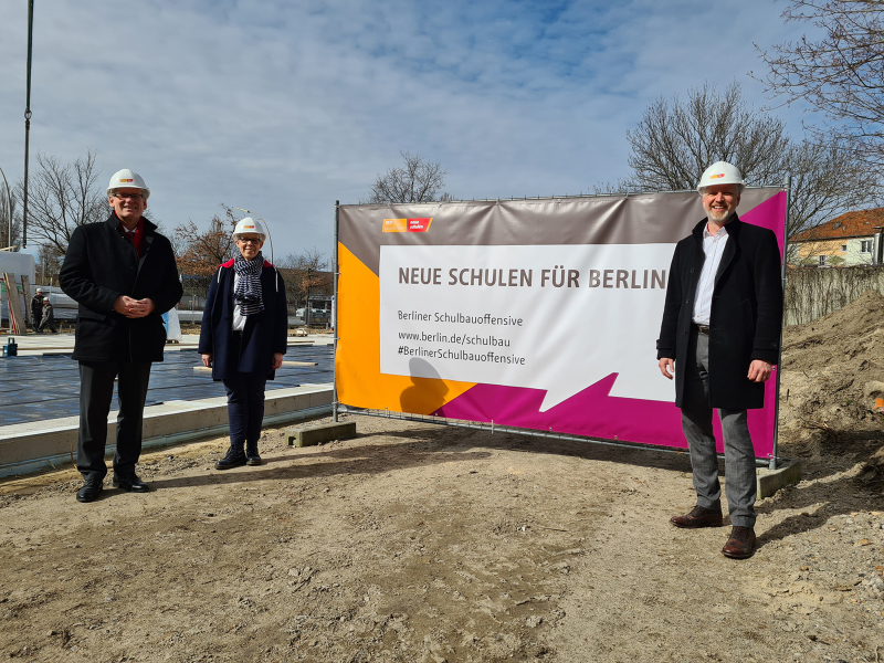 Zum Baustart besuchten Sebastian Scheel, Senator für Stadtentwicklung und Wohnen, Helmut Kleebank, Bezirksbürgermeister von Spandau, und Anja Dudkowiak, die kommissarische Schulleiterin der Birken-Grundschule, die Baustelle.