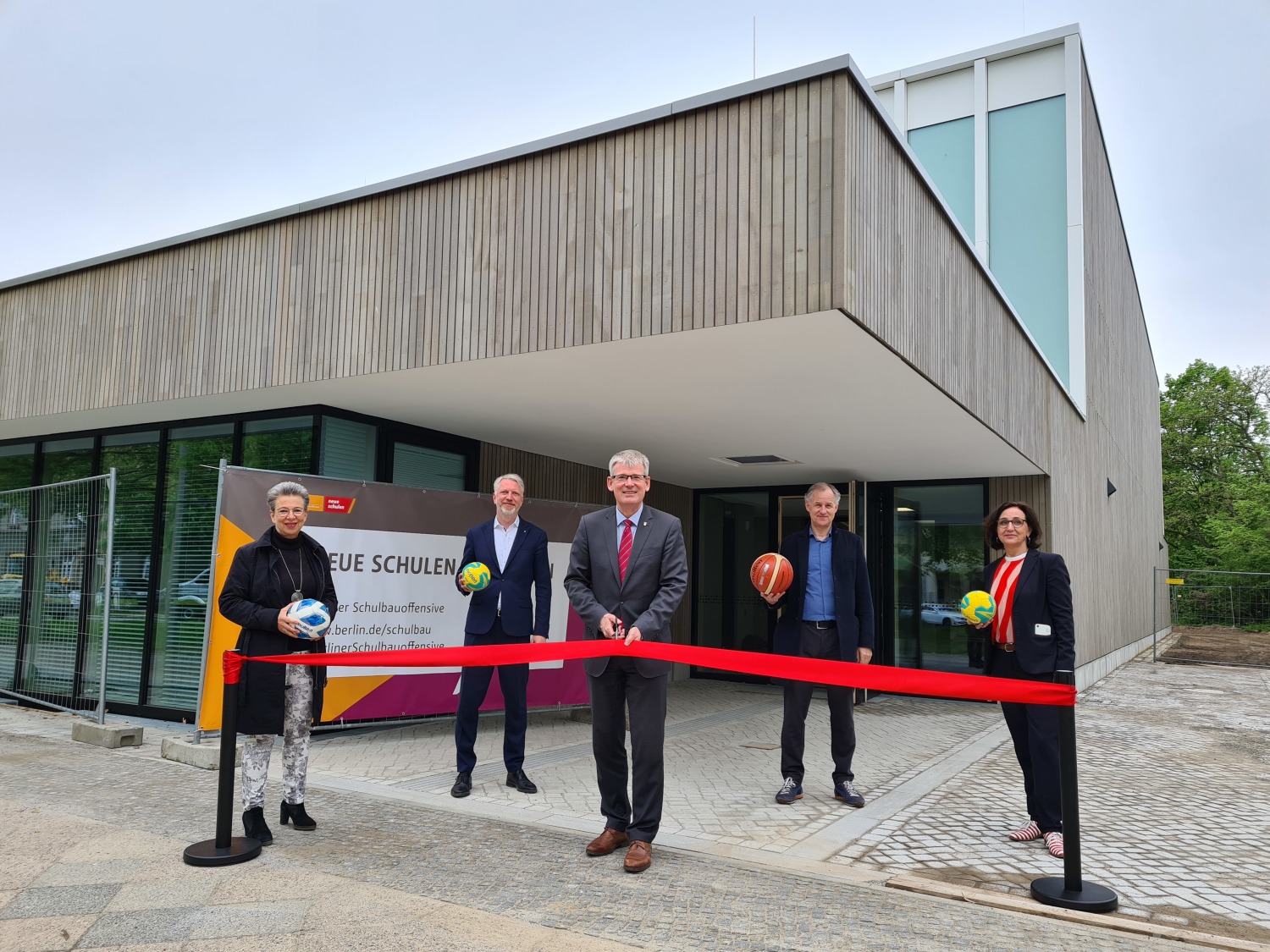 Nach knapp 16 Monaten Bauzeit konnte Ende April die berlinweit erste Typensporthalle am Standort des Spandauer Lily-Braun-Gymnasiums fertiggestellt und zur Nutzung freigegeben werden. Vergangene Woche eröffneten Sebastian Scheel, Senator für Stadtentwicklung und Wohnen, Norbert Illiges, Leiter der Steuergruppe der Taskforce Schulbau, Helmut Kleebank, Bezirksbürgermeister und Schul- und Sportstadtrat von Spandau, gemeinsam mit der Schulleiterin Ulrike Kaufmann die neue Halle.