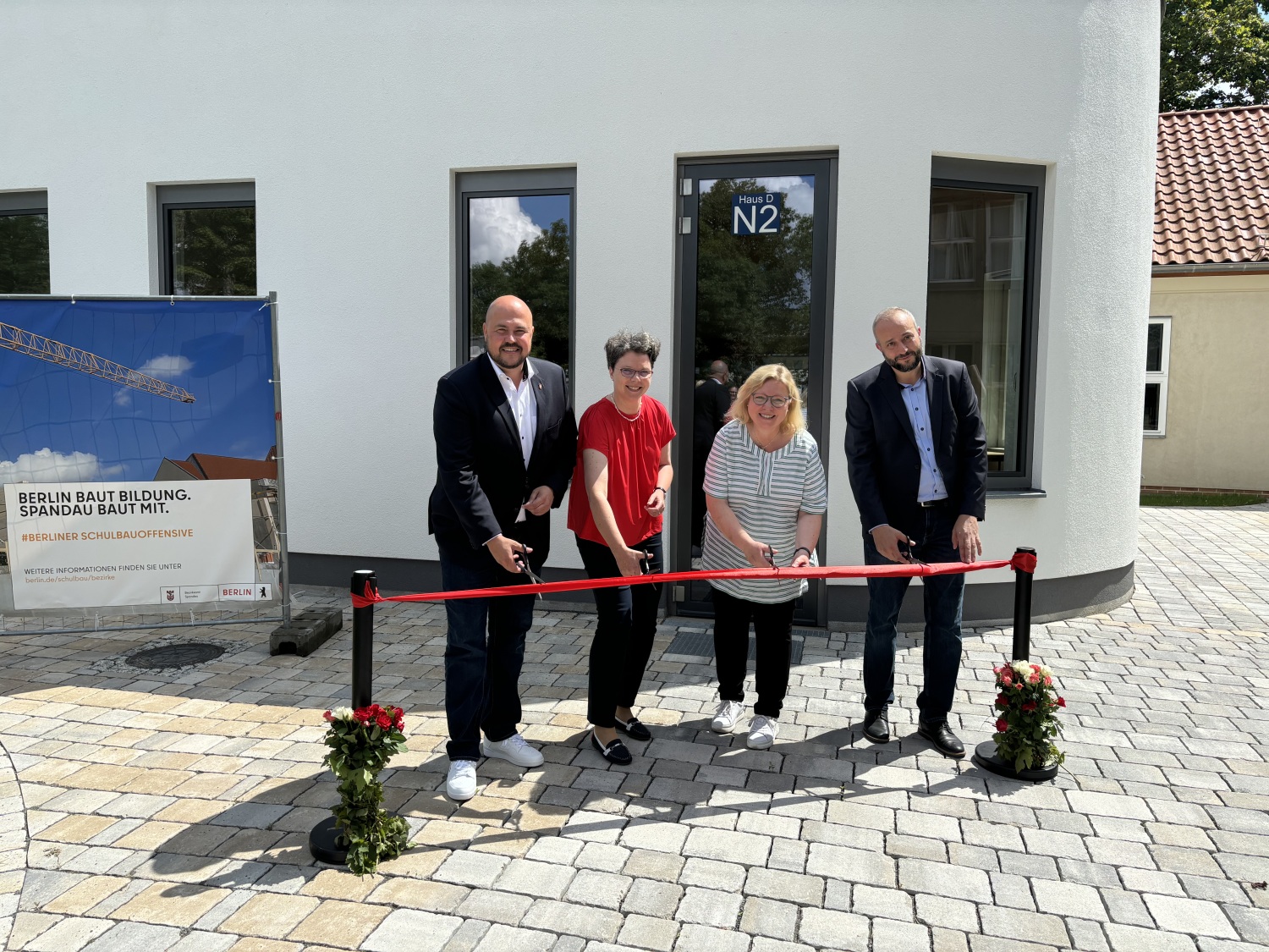 Im Beisein von Bezirksbürgermeister Frank Bewig, Bezirksstadträtin Dr. Carola Brückner sowie des stellvertretenden Schulleiters Malek Saleh wurde am gestrigen Donnerstag, den 11. Juli 2024 mit einem kleinen Festakt die Fertigstellung der neuen Räumlichkeiten in der Schule am Staakener Kleeblatt gefeiert. Die denkmalgeschützte Schulanlage wird seit 2018 schrittweise saniert. Besonderes Highlight: Die beiden neu errichteten Anbauten, die den Campus um eine lichtdurchflutete Aula mit Bühne und moderner Veranstaltungstechnik sowie einen funktional ausgestatteten Werkstattbereich ergänzen.