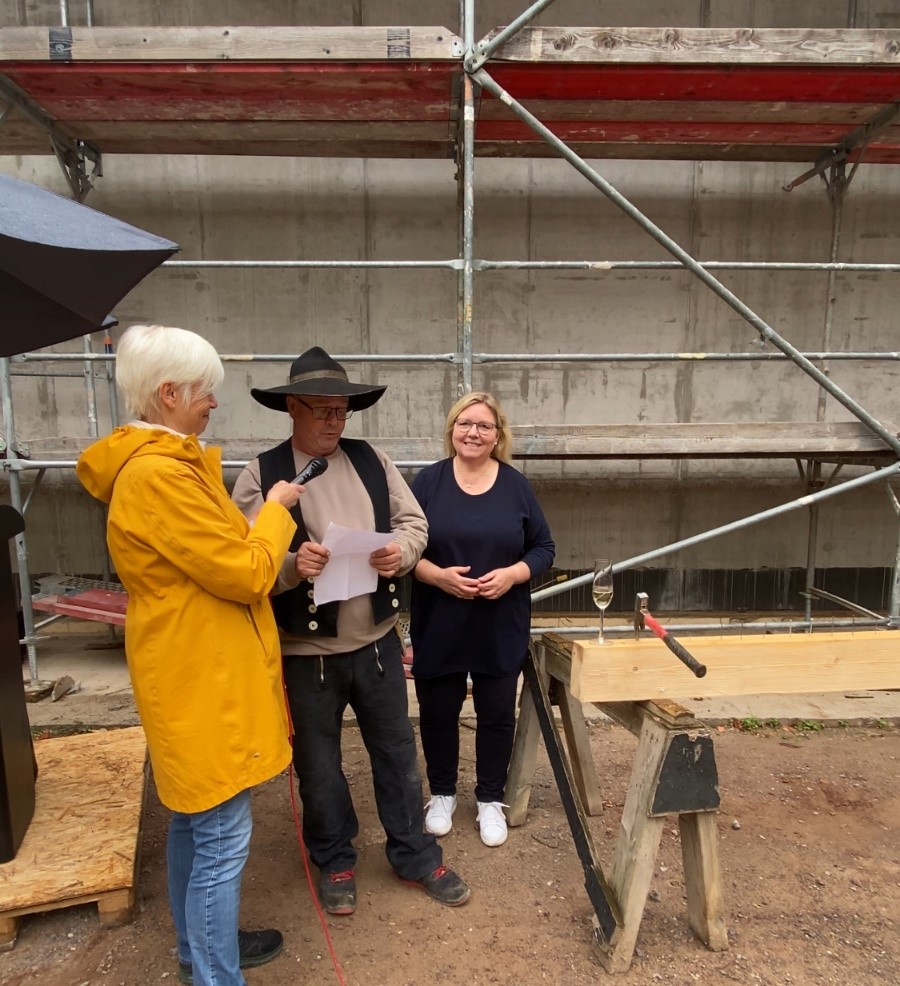 Martina Häusler, Leiterin der Serviceeinheit Facility Management, in der das bezirkliche Hochbaumanagement verortet ist, richtete das Wort an die beteiligten Gewerke: „Der Rohbau steht, das Dach ist gerichtet, nun sind die Ausbau-Gewerke an der Reihe. Sie, die Handwerker, stehen heute im Mittelpunkt, Ihnen gilt mein Dank als Bauherrin. Ich hoffe, dass alle Schulkinder sehen können, wie hier zu einem großen Teil wirklich per Hand ein Gebäude entsteht, das viele Jahrzehnte lang verschiedenen Generationen Freude bereiten wird. Dafür brauchen wir unser Handwerk.“
