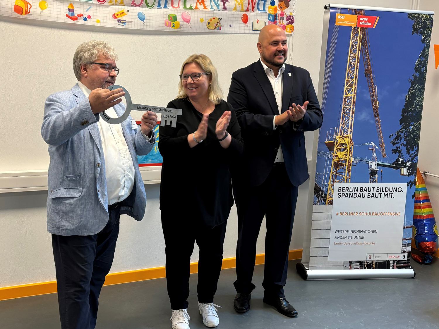Nach sieben Jahren intensiver Bauzeit ist die Gesamtsanierung der Schule am Gartenfeld erfolgreich abgeschlossen. Mit einer symbolischen Schlüsselübergabe feierte die Schulgemeinschaft, die 2017 geschlossen in die Seecktstraße 2 ausgelagert worden war, gemeinsam mit Bezirksbürgermeister Frank Bewig, Bezirksstadträtin Dr. Carola Brückner und weiteren Gästen die Fertigstellung ihres angestammten Schulstandortes in der Gartenfelder Straße 81.