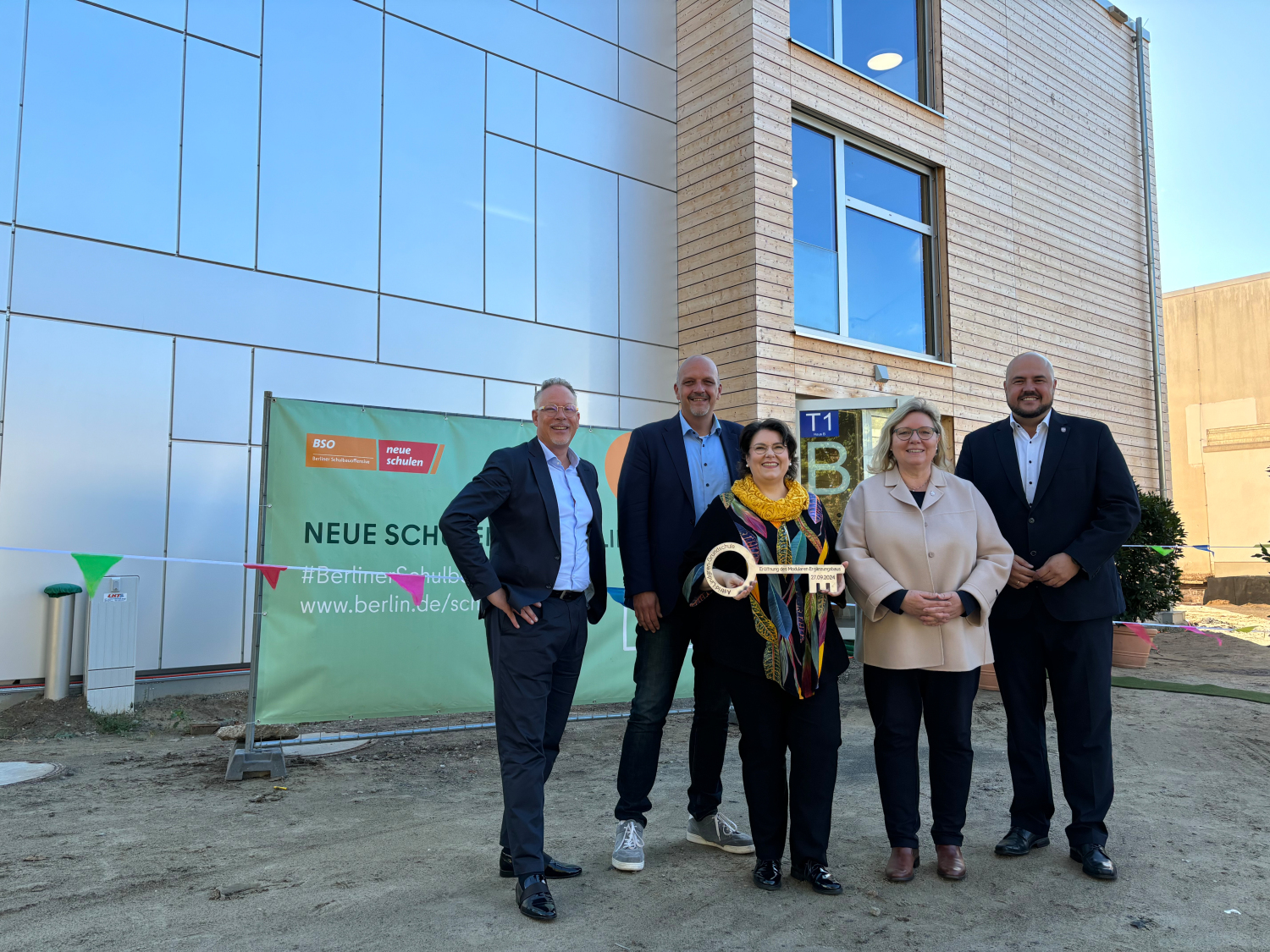 Mit viel Musik, guter Laune und einer symbolischen Schlüsselübergabe wurde am heutigen Freitag der Modulare Ergänzungsbau in Holzbauweise (Holz-MEB) an der Astrid-Lindgren-Grundschule feierlich eröffnet. Unter den Gästen der Schulgemeinschaft um Schulleiterin Gabi Dietrich waren auch Berlins Staatssekretär für Mieterschutz und Wohnen Stephan Machulik, Spandaus Bezirksbürgermeister Frank Bewig und Schulstadträtin Dr. Carola Brückner.