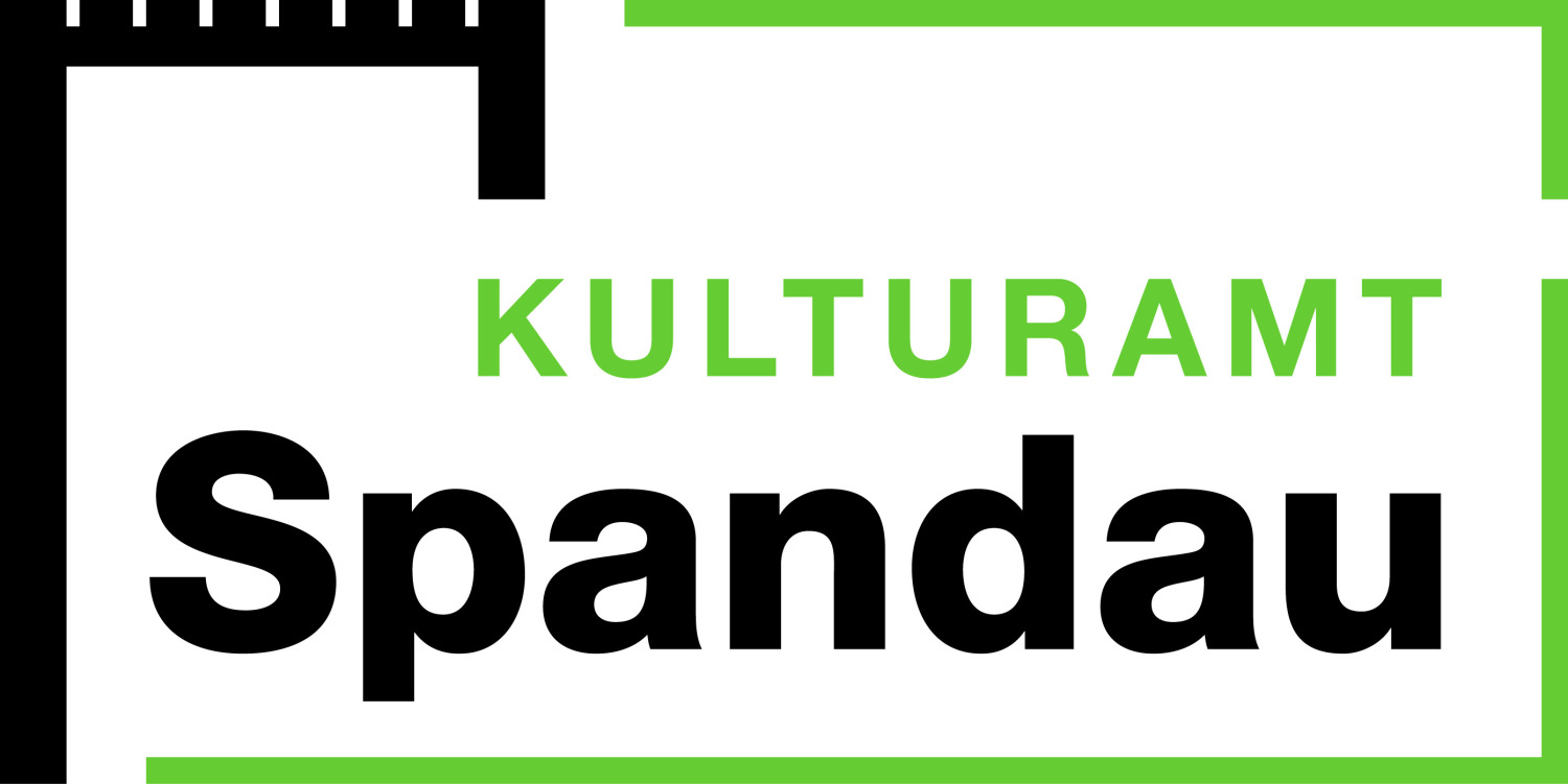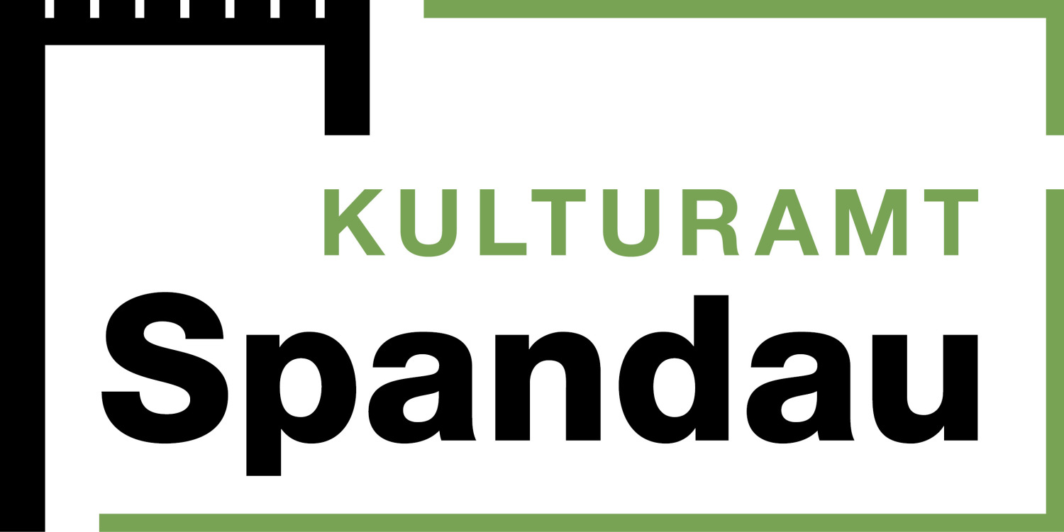 Der Schriftzug enthält in der oberen Zeile in grüner Schrift das Wort “Kulturamt” in Großbuchstaben. In der unteren Zeile ist das Wort “Spandau” in schwarz zu lesen. Der Rahmen ist ebenfalls zweifarbig und unterbrochen. Der linke Teil des Rahmens stellt den stilisierten Juliusturm in schwarz dar. Der restliche Rahmen ist grün und auf der rechten Seite im oberen Drittel unterbrochen.