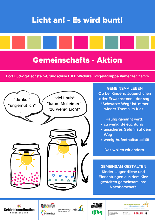 Eine Aktion des Nachbarschaftshaus Wannseebahn e.V., in Kooperation mit der Gebietskoordination Kamenzer Damm sowie dem Hort der Ludwig-Bechstein-Grundschule (tjfbg gGmbH) und der Jugendfreizeiteinrichtung Wichura, im Rahmen des Förderprogramms „Stärkung Berliner Großsiedlungen“ am Kamenzer Damm.