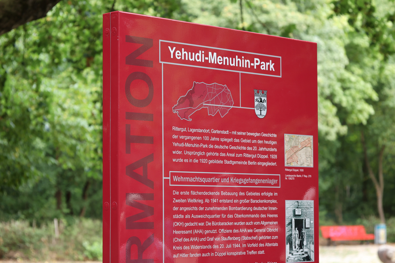 Mit der Übergabe der 25. regionalhistorischen Informationsstele an die Öffentlichkeit, durch die stellvertretende Bezirksbürgermeisterin und Bezirksstadträtin für Bildung, Kultur und Sport Cerstin Richter-Kotowski, wurde eine ideale Ergänzung der bereits vorhandenen Stelen umgesetzt. Hier können sich ab sofort interessierte Bürgerinnen und Bürger über die bewegende Entstehungsgeschichte des Yehudi-Menuhin-Parks im 20. Jahrhundert informieren. Den Text der Stele hat der Autor Dr. Wolfgang Ellerbrock erarbeitet.