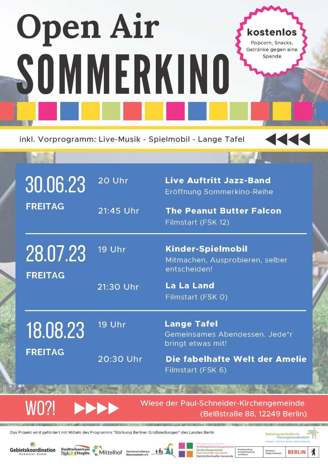 Die ausgewählten Filme werden von Juni bis August an drei Kino-Abenden auf dem Außengelände der Paul-Schneider-Kirchengemeinde (Belßstraße 88, 12249 Berlin) vorgeführt. Begleitet werden die Filmvorführungen von einem abwechslungsreichen Vorprogramm. Es gibt Live-Musik, wir haben das Spielmobil zu Besuch und den letzten Filmabend schließen wir mit einer gemeinsamen langen Tafel.