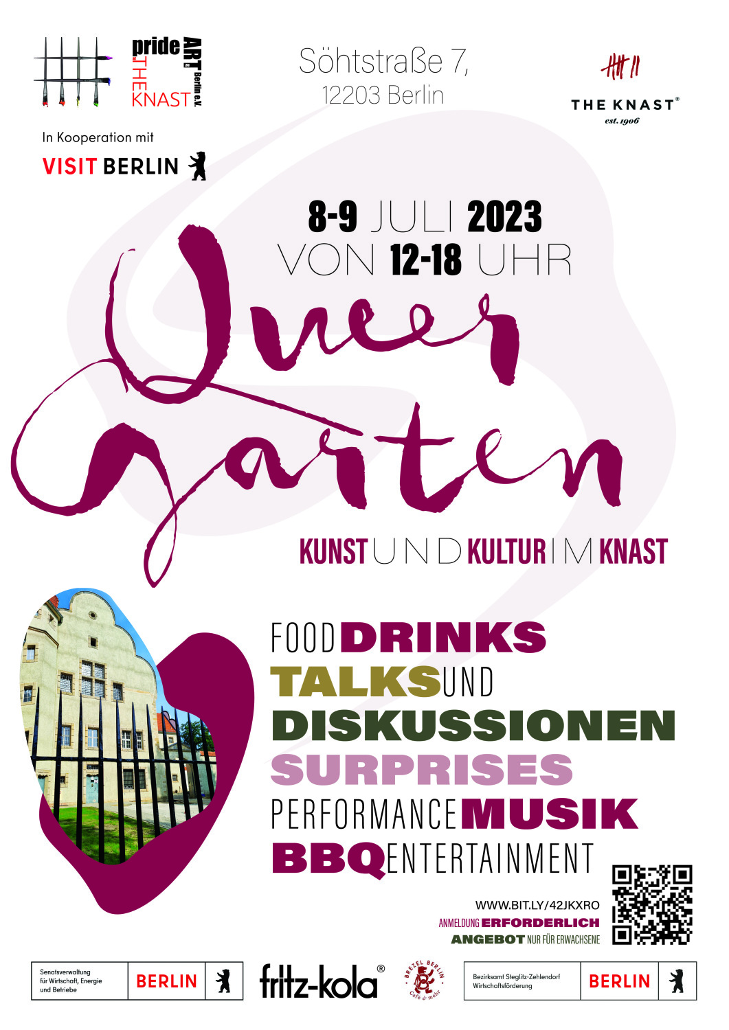 Am Wochenende vom 8. und 9. Juli 2023 findet pünktlich zum Pride Month und der sommerlichen Jahreszeit erstmalig in dieser Größenordnung im Berliner Südwesten ein zweitägiges queeres Kunst- und Kulturfest in der Eventlocation The Knast statt. Die Eigentümer:innen von The Knast und der ansässige Künstler:innenverein prideArt Berlin e.V. haben ein umfassendes Programm mit Highlights aus der queeren Kunstwelt, Performances und Paneltalks auf die Beine gestellt.
