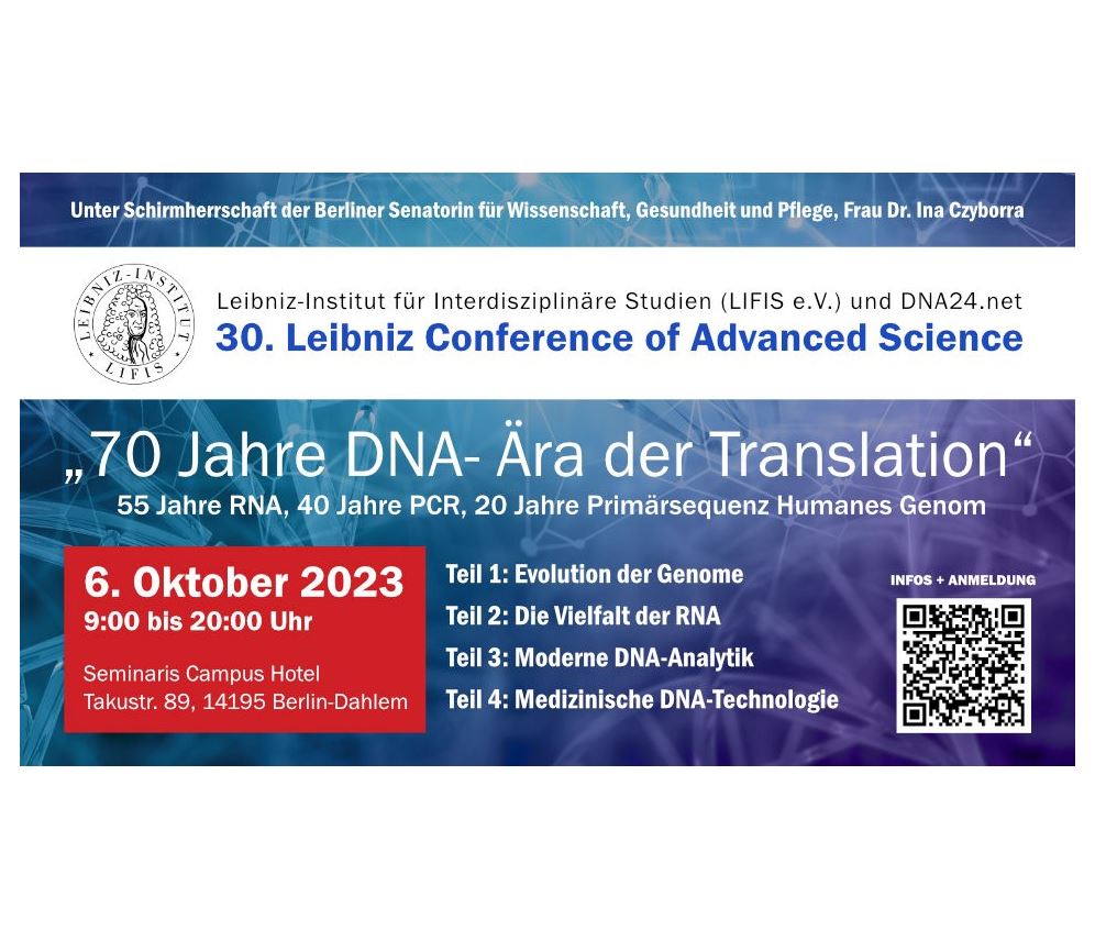 Mit dieser Konferenz würdigt das Leibniz-Institut für interdisziplinäre Studien (LIFIS e.V.) mit seinen regionalen Partnern Regionalinkubator Berlin Südwest, die Geschäftsstelle Zukunftsorte Berlin und die Freie Universität den 70. Jahrestag der Entdeckung der DNA-Doppelhelix, dem zentralen Molekül der Genomforschung. Diese Entdeckung in der Molekularbiologie war grundlegend für die heutige Biomedizin und ist von unendlich großer Bedeutung für die menschliche Gesellschaft. Besondere Beachtung bei dieser Konferenz liegt auf der praktischen Anwendung der gewonnenen Ergebnisse zur Veränderung der DNA für medizinische Behandlungen in den letzten zehn Jahren. Bekannt sind die RNA-Impfstoffe während der COVID-Pandemie, aber auch die Genom-Editiermethoden wie CRISPR-CAS oder die genmodifizierten CAR-T-Zellen zur effektiven Behandlung von Blutkrebs.