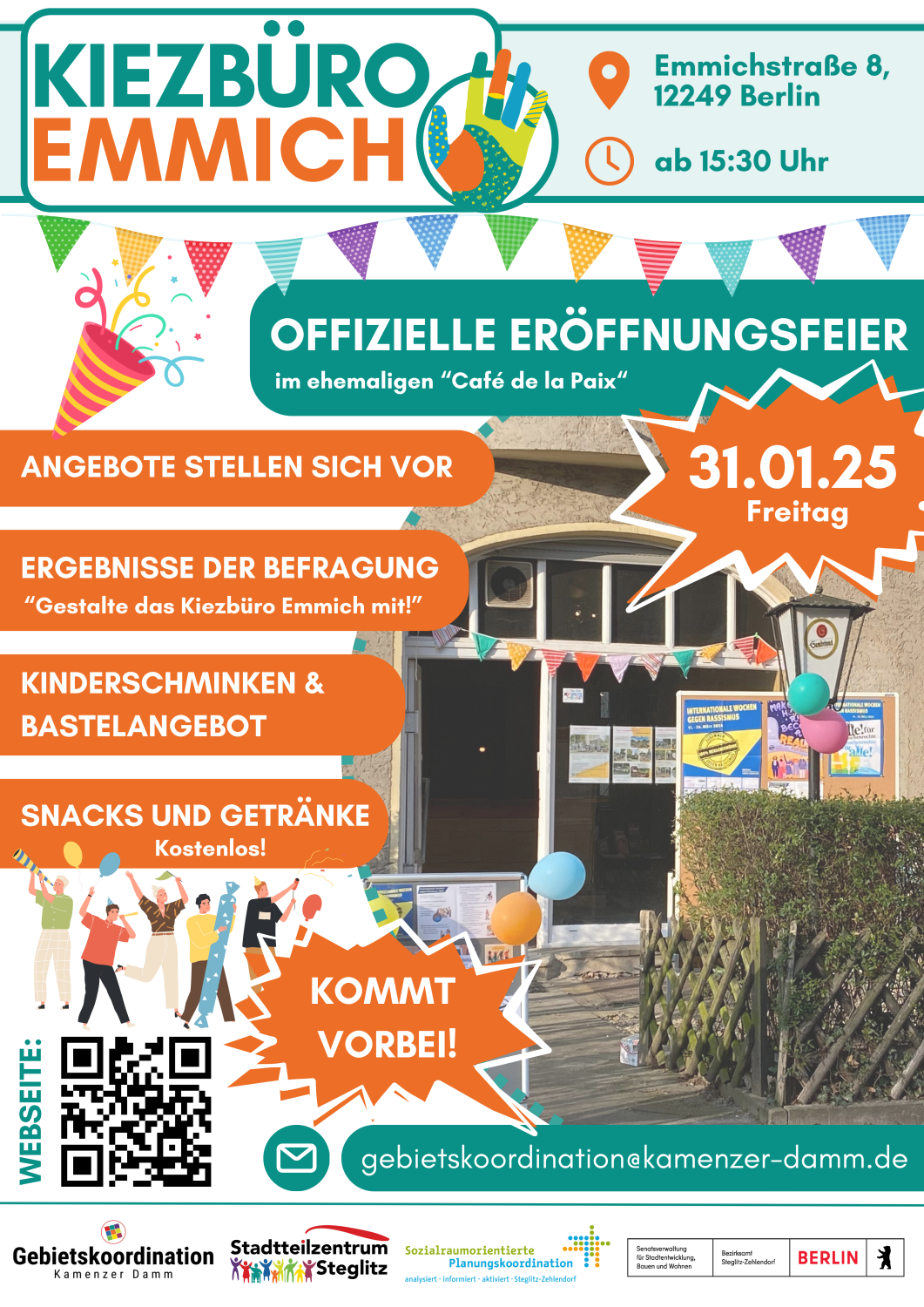 Am Freitag, den 31.01.2025 feiert das Kiezbüro Emmich in der Emmichstraße 8, 12249 Berlin seine Eröffnung! Alle Nachbarinnen und Nachbarn sowie Interessierte sind herzlich eingeladen ab 15:30 Uhr mitzufeiern.