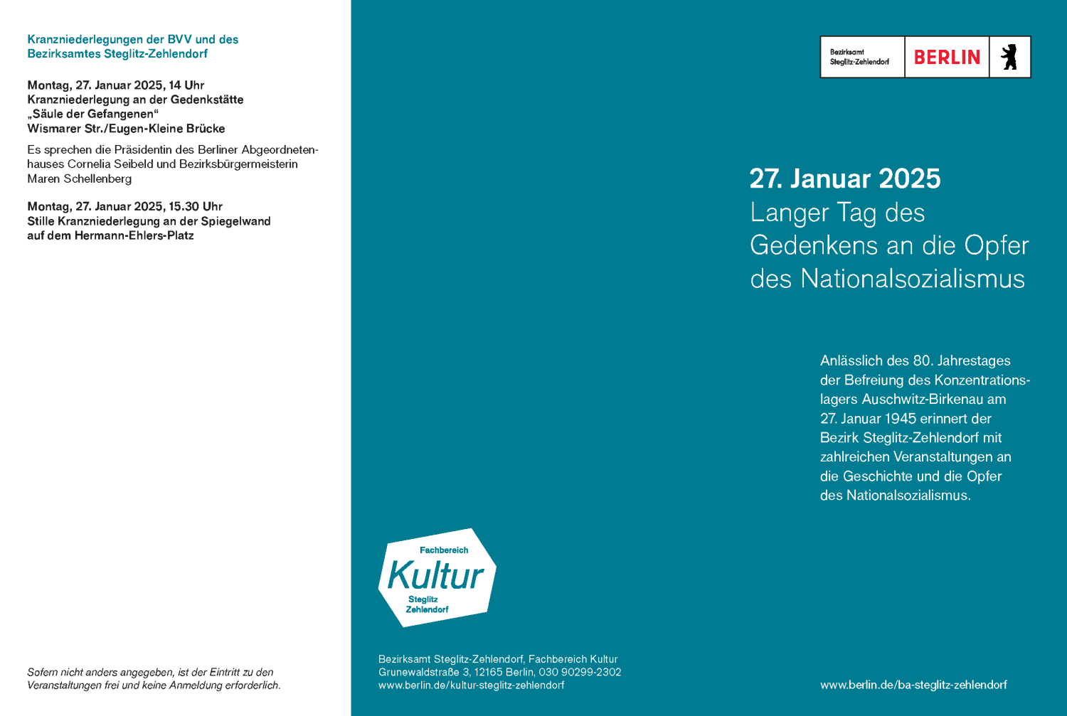 Anlässlich des 80. Jahrestages der Befreiung des Konzentrationslagers Auschwitz-Birkenau am 27. Januar 1945 erinnert der Bezirk Steglitz-Zehlendorf mit einem langen Tag des Gedenkens an die Geschichte und die Opfer des Nationalsozialismus.