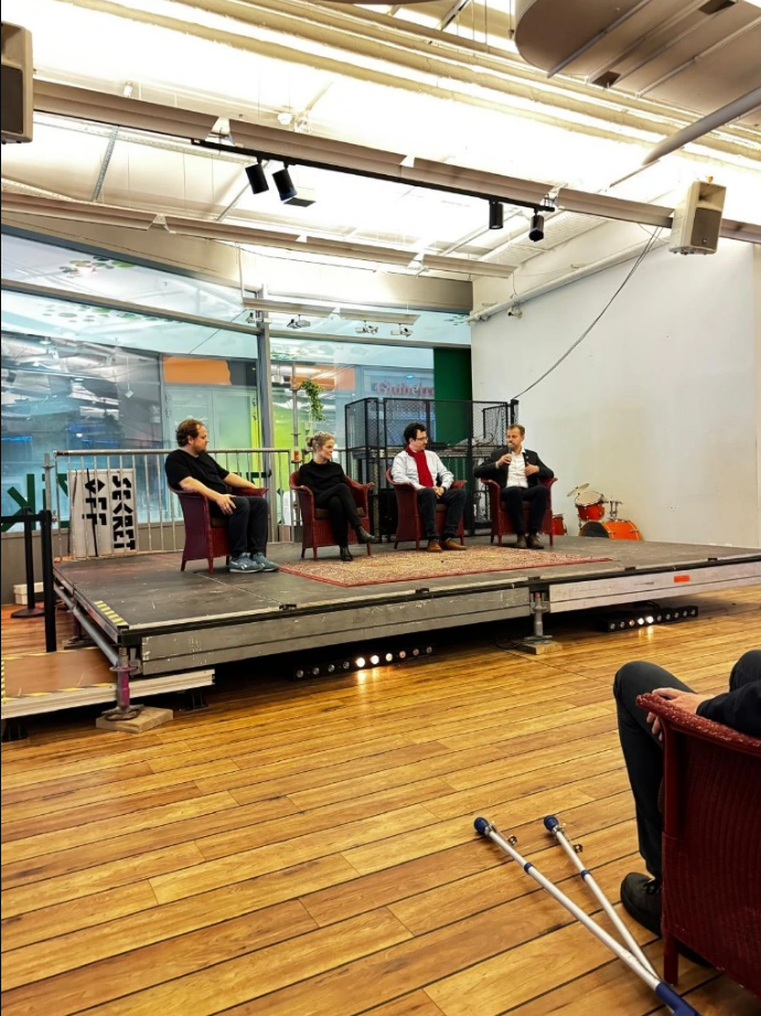 Es folgte eine Podiumsdiskussion mit Akteurinnen und Akteuren aus Verwaltung, Wirtschaft und Stadtentwicklung. Neben dem Gastgeber und Geschäftsführer des Zwischennutzungsprojekts, Moritz Senff, nahmen Anna-Meike Harms, Leiterin der Taskforce Warenhäuser/Einzelhandel der Senatsverwaltung für Wirtschaft, Energie und Betriebe, Patrick Steinhoff, Bezirksstadtrat für Stadtentwicklung von Steglitz-Zehlendorf und Juri Effenberg, Projektleiter des Regionalinkubators Berlin Südwest, teil.