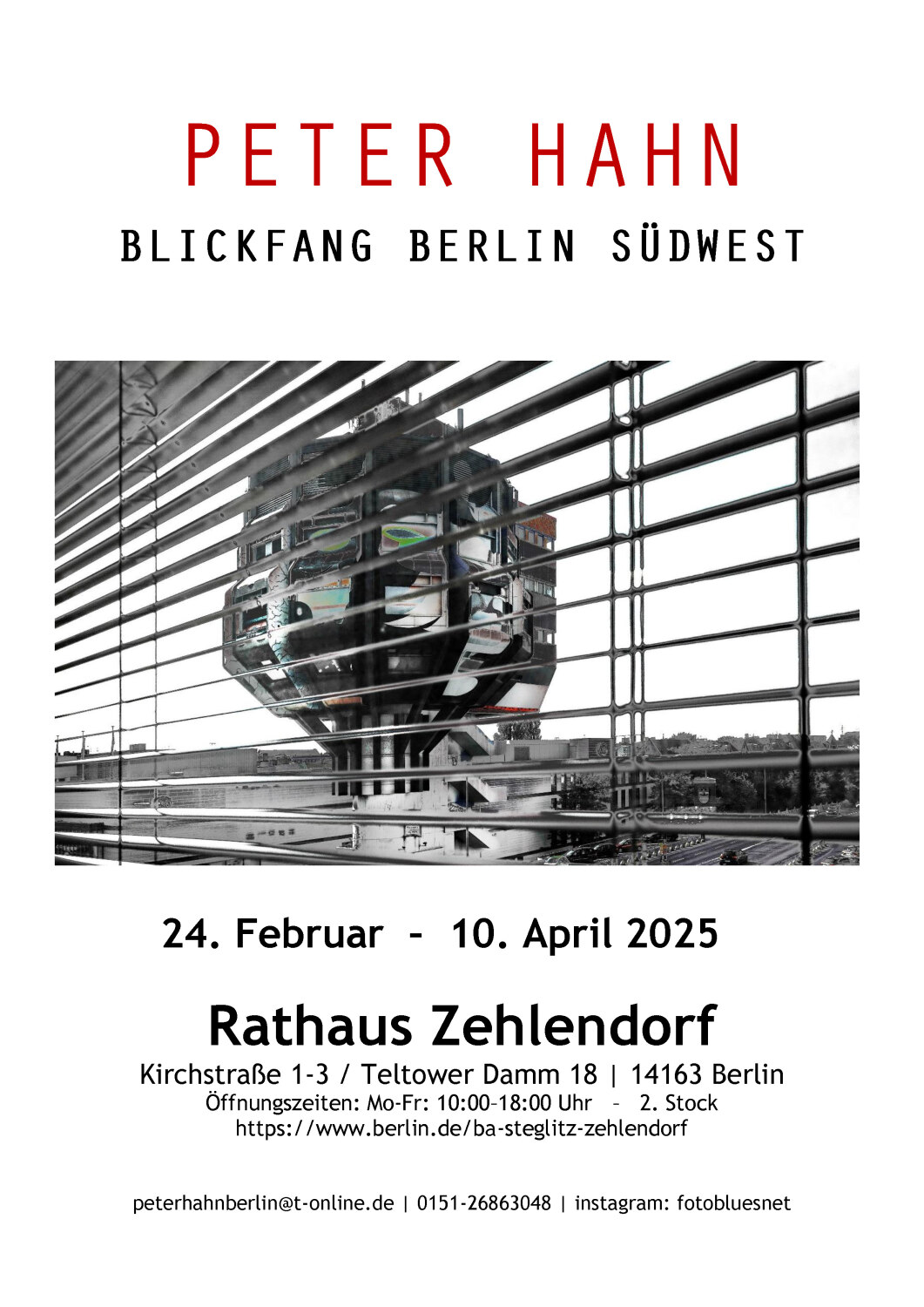 Frau Richter-Kotowski, Bezirksstadträtin für die Bereiche Bildung, Kultur und Sport, lädt herzlich zur Finissage der seit dem 24. Februar 2025 im Rathaus Zehlendorf unter ihrer Schirmherrschaft stattfindende Foto-Ausstellung „Blickfang Berlin Südwest“ von Peter Hahn ein. Sie begrüßt Sie am 8. April 2025 – 17:00 Uhr im 1. Stock des Rathauses.