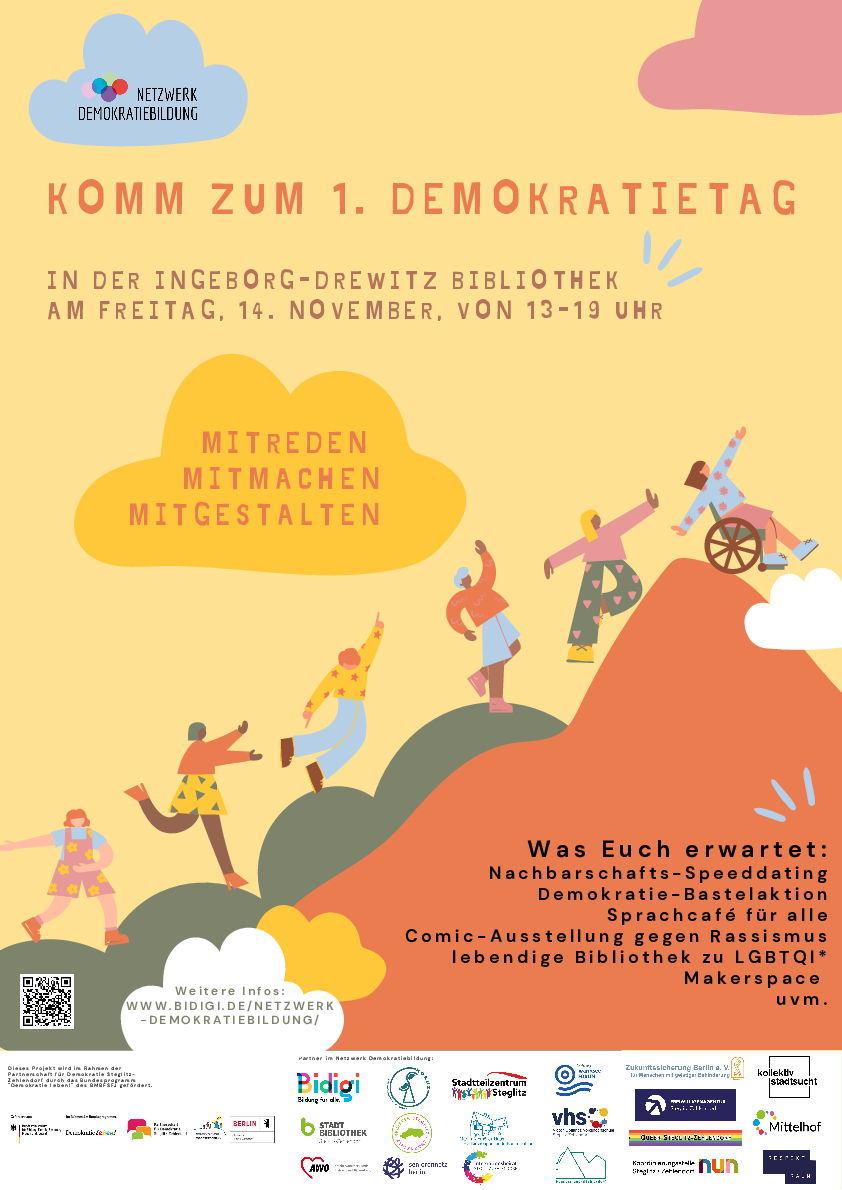 Unter dem Motto „Mitmachen, Mitreden, Mitgestalten“ lädt das Netzwerk Demokratiebildung zum 1. Demokratietag in die Ingeborg-Drewitz-Bibliothek in Steglitz-Zehlendorf ein. Dieses Projekt wird im Rahmen der Partnerschaft für Demokratie Steglitz-Zehlendorf durch das Bundesprogramm „Demokratie leben!” des BMBFSFJ gefördert.