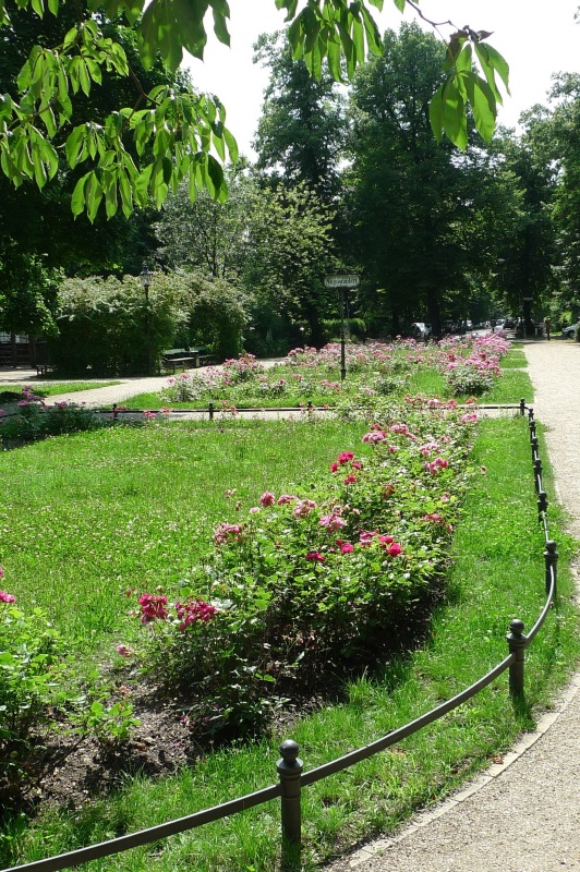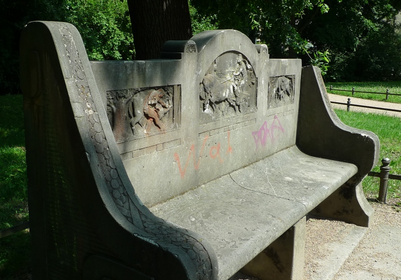 Tiergartengitter* schützen die Vegetationsflächen, gusseiserne Ruhebänke sowie gusseiserne Poller sind typisches Gartenzubehör aus der Zeit der Jahrhundertwende.