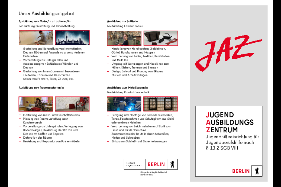 In diesem Flyer finden Sie Informationen rund um das Jugendausbildungszentrum (JAZ) in Steglitz-Zehlendorf, z.B. das Ausbildungsangebot, Voraussetzungen, Leistungen etc.