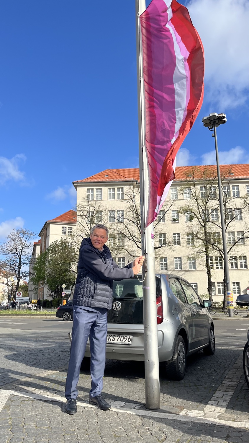 Am heutigen 26. April feiert der Bezirk Tempelhof-Schöneberg den Tag der lesbischen Sichtbarkeit. Bezirksbürgermeister Jörn Oltmann hat zu diesem Anlass die Lesben*-Flagge vor dem Rathaus Schöneberg gehisst.