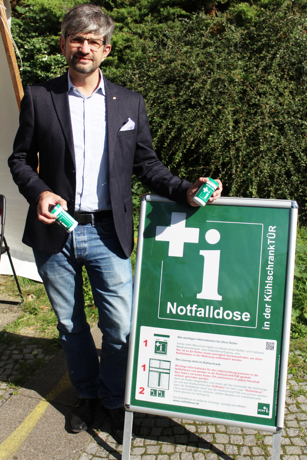 Gesundheitsstadtrat Oliver Schworck nimmt traditionell den Internationalen Tag der Patientensicherheit zum Anlass, um den Bürger_innen in Tempelhof-Schöneberg im Rahmen eines Informationsmarktes die sogenannte Notfalldose vorzustellen und – soweit der Vorrat reicht – auch kostenlos auszugeben.