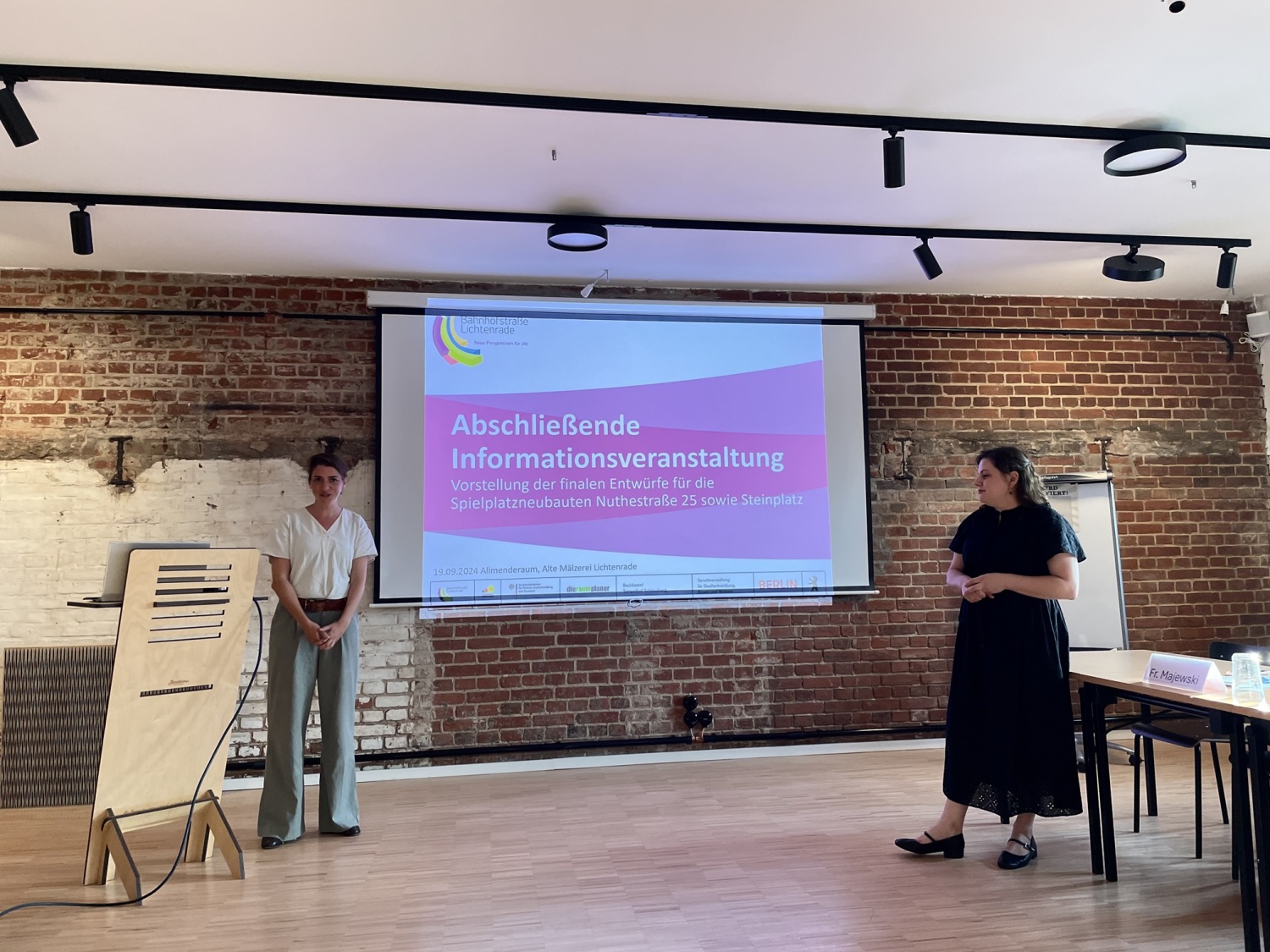 Am Donnerstag, den 19. September 2024, präsentierten die Bezirksstadträtinnen Dr. Saskia Ellenbeck und Eva Majewski, der Fachbereich Grünflächen des Straßen- und Grünflächenamtes Tempelhof-Schöneberg sowie das beauftragte Planungsbüro interessierten Anwesenden die finalen Entwürfe der Spielplatzneubauten Spielplatz Nuthestraße 25 und Kleinkinderspielplatz Steinplatz. Die Informationsveranstaltung fand in der Alten Mälzerei in Lichtenrade statt. Die Besucher_innen konnten im Nachgang ihre Fragen an die Referent_innen stellen.