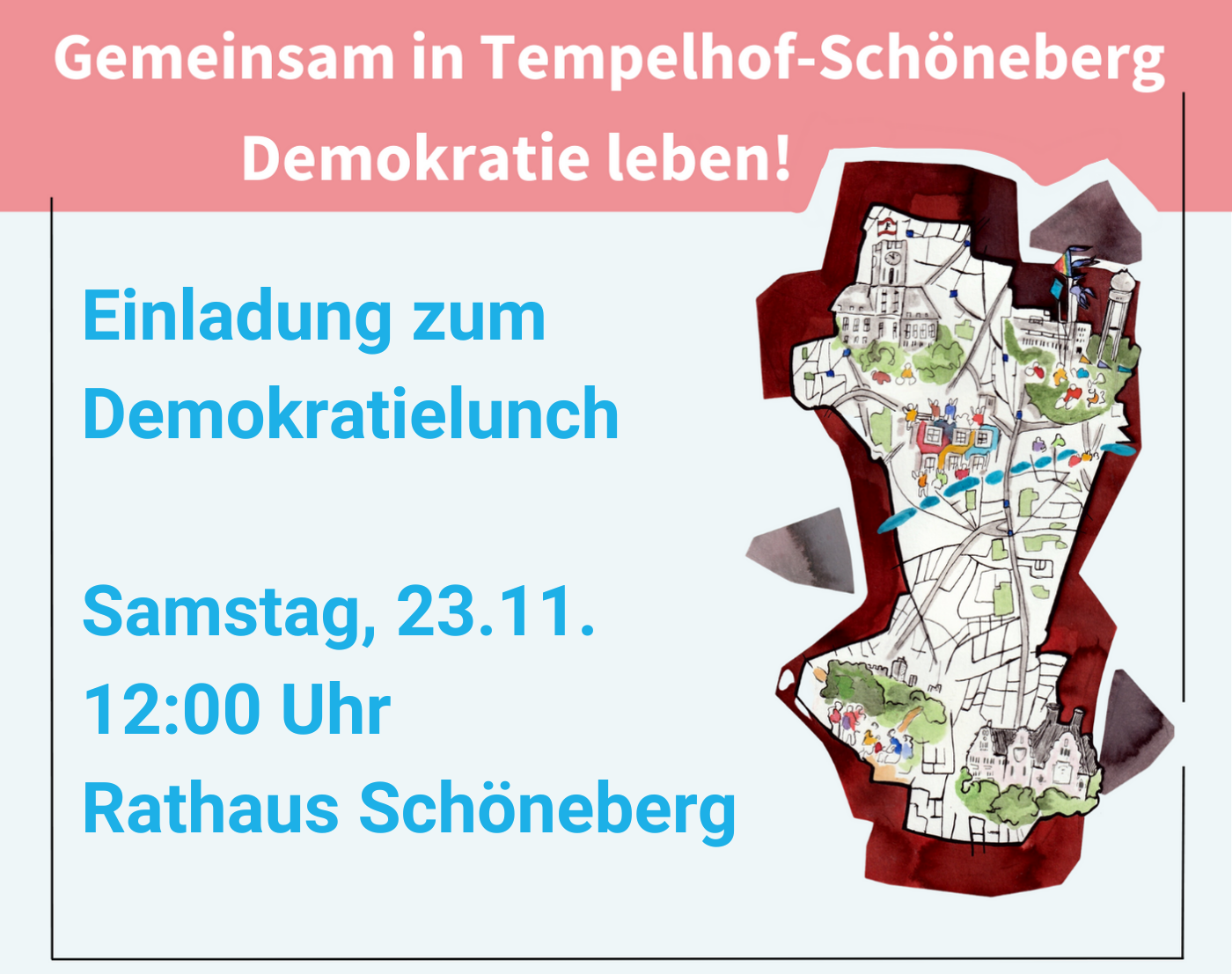 Die bezirkliche Partnerschaft für Demokratie „Gemeinsam in Tempelhof-Schöneberg – Demokratie leben!“ lädt zum Demokratielunch ins Rathaus Schöneberg ein. Eingeladen sind alle Engagierten aus dem Bezirk, aus Vereinen und Initiativen und Menschen aus der Verwaltung und der Zivilgesellschaft.