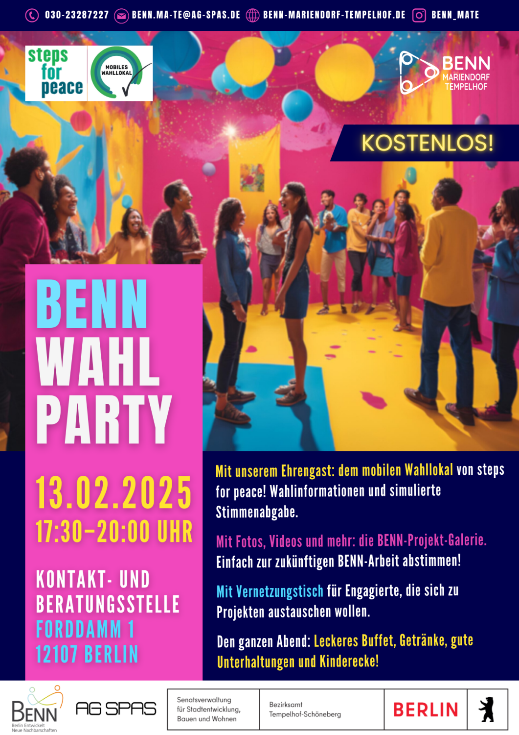 Das BENN-Team (Berlin Entwickelt Neue Nachbarschaften) Mariendorf-Tempelhof und das mobile Wahllokal laden zur „Wahlparty“ in die Kontakt- und Beratungsstelle „Die Kurve“ ein: