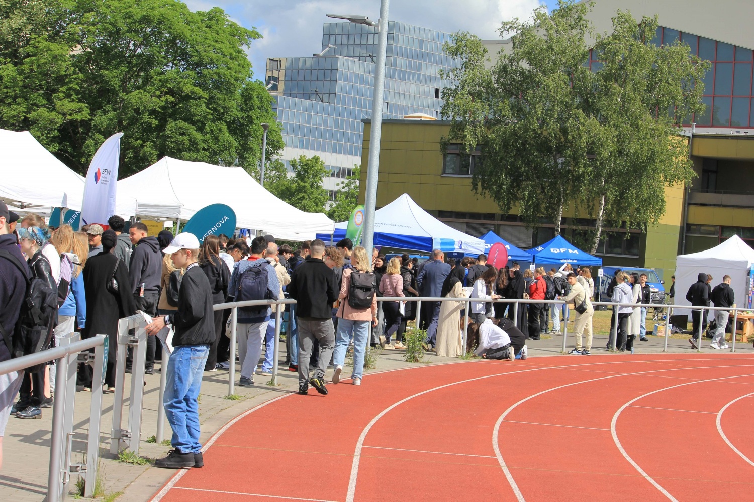 Bereits zum 27. Mal fand der Aktionstag Ausbildung, die Ausbildungsmesse in Tempelhof-Schöneberg, statt. Unter dem Motto „Mach dein Ding“ wurde am 15. Mai 2025 wie bereits in den letzten zwei Jahren der Dominicus-Sportplatz genutzt, um Jugendliche mit ihrem potenziellen Ausbildungsgeber in Kontakt zu bringen. Pünktlich um 10:00 Uhr eröffnete Bezirksbürgermeister Jörn Oltmann zusammen mit Bezirksstadtrat Tobias Dollase, Mario Lehwald, dem Vorstandsvorsitzenden Geschäftsführer der Agentur für Arbeit Süd, und Sabine Hiersemann, der Koordinatorin des Netzwerks Ausbildung Tempelhof-Schöneberg, die Messe mit der Durchtrennung des roten Bandes am Eingang.