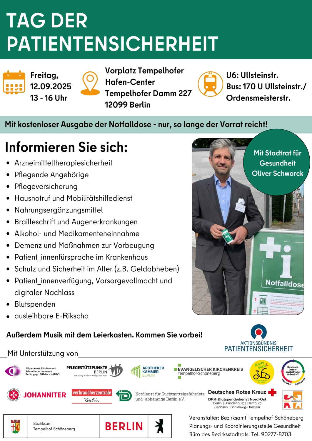 Die Aktion findet erneut vor dem Tempelhofer Hafen-Center statt. Eingerahmt wird die Ausgabe der Notfalldosen von einem vielfältigen Beratungs- und Informationsangebot rund um das Thema Patientensicherheit an weiteren Marktständen. Mit dabei sind die Beratungsstelle für Menschen mit Behinderungen, Krebs und chronischen Erkrankungen des Gesundheitsamtes, der Allgemeine Blinden- und Sehbehindertenverein Berlin sowie die Alkohol- und Medikamentenberatungsstelle Tempelhof-Schöneberg. Auch die Apothekerkammer, der DRK Blutspendedienst Nord-Ost, die Senior_innenarbeit des Sozialamtes, die Verbraucherzentrale Berlin, der VdK-Pflegestützpunkt mit dem gerontopsychiatrischen Verbund Tempelhof-Schöneberg e.V. und der Evangelische Kirchenkreis Tempelhof-Schöneberg sind vertreten. Die E-Rikscha mit Beratungen des Trägers fLotte SoziaL zur Ausleihe und der Mobilitätshilfedienst der Johanniter-Unfall-Hilfe e.V. runden das Informationsangebot ab. Die Lotsinnen der präventiven Berliner