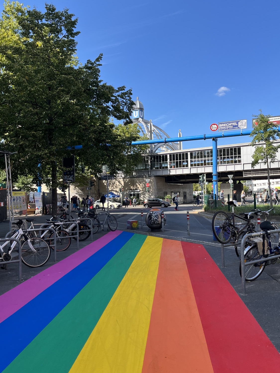 Der Regenbogenkiez hat ein neues, sichtbares Symbol der Vielfalt: Die Maaßenstraße wurde am 25. August 2025 auf rund 120 Quadratmetern in den Farben der Regenbogenflagge gestaltet. Die frisch bemalte Fläche ist schon aus der U-Bahn erkennbar und macht die Bedeutung des Viertels für die queere Community noch sichtbarer.