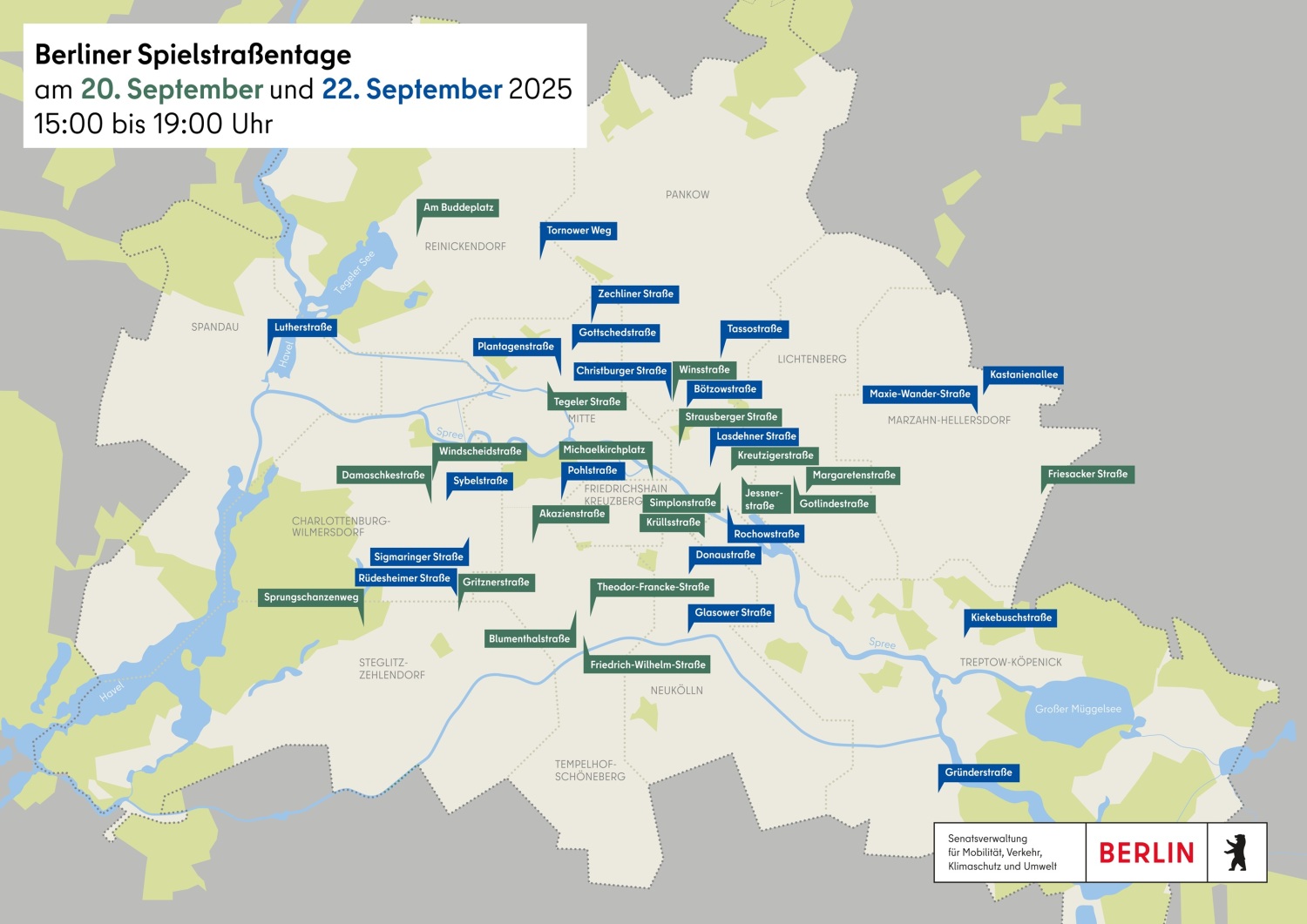 Berlinweit können Spielstraßen unabhängig von den Spielaktionstagen als regelmäßig stattfindende Termine beantragt werden. Alle Infos zu den Voraussetzungen für die sichere Durchführung, Beantragung und Unterstützung gibt es bei der landesweiten Ansprechperson für temporäre Spielstraßen sowie beim Bündnis Temporäre Spielstraßen.