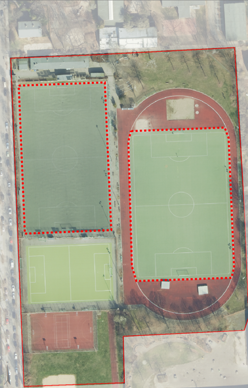 Beide Spielfelder verfügen derzeit über einen Gummi Granulat/Sandgemisch verfüllten Kunstrasenbelag, welcher nun durch einen sandverfüllten Kunststoffrasen ersetzt wird.