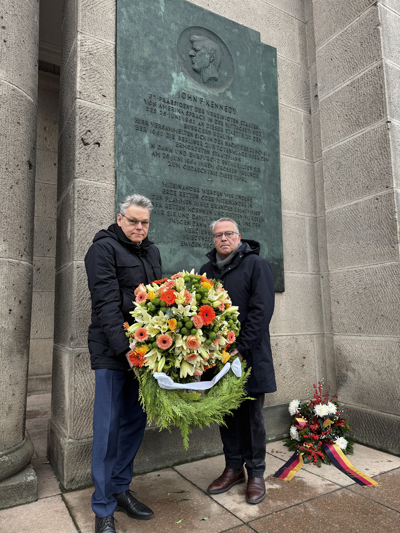 Anlässlich des 62. Jahrestages des Attentats auf US-Präsident John F. Kennedy legten Bezirksbürgermeister Jörn Oltmann und Bezirksverordnetenvorsteher Stefan Böltes heute einen Kranz am Rathaus Schöneberg nieder. Der Bezirk Tempelhof-Schöneberg verweist so alljährlich gebührend auf die herausragende Rolle Kennedys für die Freiheit Berlins und den Frieden für die Menschen in der Stadt. Der Ort für die Kranzniederlegung ist bewusst gewählt, denn direkt neben dem Eingang zum Rathaus befindet sich eine bronzene Gedenktafel zu Ehren des einstigen US-Präsidenten.