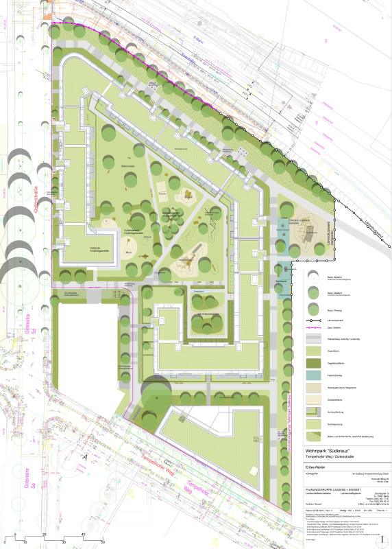 Hinsichtlich der aus der Projektentwicklung resultierenden Wohnfolgebedarfe ist die gebietsinterne Anlage einer Kindertagesstätte sowie von Nahversorgungseinrichtungen vorgesehen. Es wird davon ausgegangen, dass Grundschulplätze in ausreichender Anzahl in der näheren Umgebung vorhanden sind. Der gesamte nördliche Grundstücksbereich ist Wohngebäuden für unterschiedliche Nutzergruppen (Familien, Studenten, Mehrgenerationen) vorbehalten. Im Südosten hingegen soll ein gemischt genutztes Gebäude mit kleinteiligen Gewerbebetrieben, Arztpraxen und Seniorenwohnungen entstehen. Der Tempelhofer Weg soll zukünftig als attraktive Stadtstraße umgestaltet werden, wobei die geplante Mischnutzung zur Belebung dieser Quartiersachse beitragen soll. Um Nutzungskonflikten vorzubeugen, soll im denkmalgeschützten Bestandsgebäude an der Ecke Gotenstraße/ Tempelhofer Weg ausschließlich wohnverträgliches Gewerbe zugelassen werden. Damit entspricht das Vorhaben den Planungen in der näheren Umgebung, die