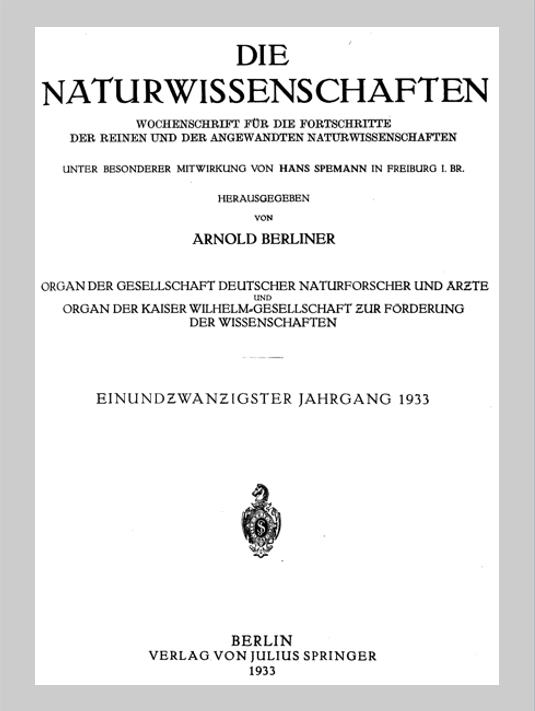 Zeitschriftencover "Die Naturwissenschaften": Die Zeitschrift ist bis heute unter dem Titel "The Science of Nature" ein Flaggschiff des Julius Springer Verlags. Zu Ehren des Gründungsherausgebers vergibt der Verlag seit 2013 den Arnold Berliner Award.