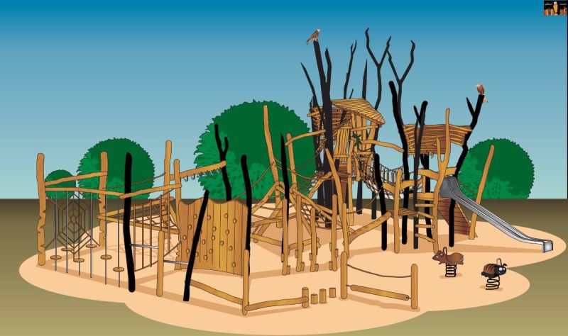 Bestandteil der Maßnahme wird sein, dass die vorhandene Balancierschlange und die Holzspielfiguren saniert werden. Die Spielkombination wird zurückgebaut und durch eine neue ersetzt, welche den neuen Nutzungsanforderungen gerecht wird. Bei der Planung wurde darauf geachtet, dass ein attraktives und vielseitiges Spielangebot mit den Spielfunktionen Klettern, Hangeln und Rutschen geschaffen wird.