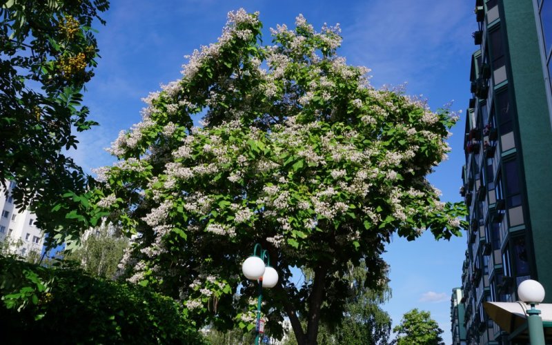 Der Herzblättrige Trompetenbaum, der Japanische Schnurbaum, der Kentucky-Coffeetree (auch Geweihbaum genannt), das Chinesische Rotholz (auch Urweltmammutbaum genannt) oder die Schwedische Mehlbeere – bei solch wohlklingenden Namen wähnt man sich in einem botanischen Garten, aber nicht unbedingt im Grünzug des Altglienicker Kosmosviertels. Dieser hat tatsächlich wahrhafte Schätze an Baum- und Straucharten zu bieten, die in Berlin äußerst selten zu finden sind.