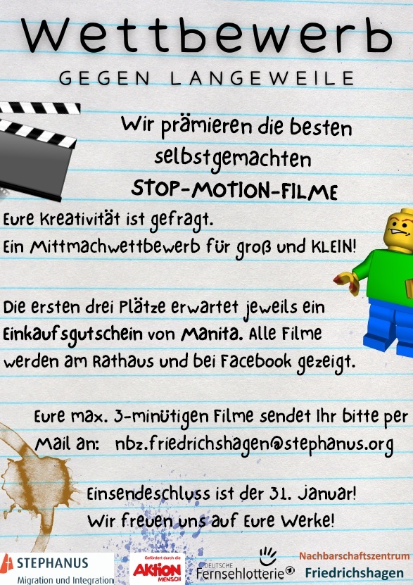 Die besten 3 Stop-Motion-Filme aus dem Kiez werden mit tollen Gutscheinen von Manita Spielzeug prämiert und alle Filme werden öffentlich am Rathaus-Friedrichshagen und auch auf der Facebook-Seite des Nachbarschaftszentrums gezeigt.