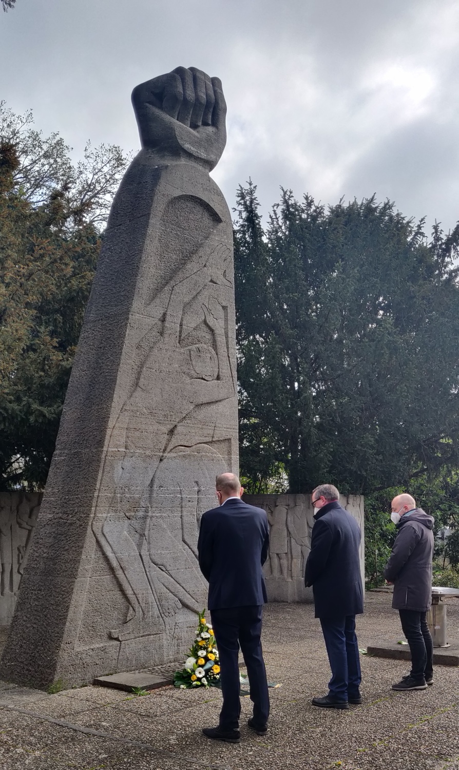 Anlässlich des 76. Jahrestages der Befreiung vom Nationalsozialismus legten Bezirksbürgermeister Oliver Igel, der Vorsteher der Bezirksverordnetenversammlung, Herr Peter Groos, sowie der stellvertretende Vorsteher der Bezirksverordnetenversammlung, Herr André Schubert, heute Vormittag am Platz des 23. April einen Kranz zum Gedenken nieder.