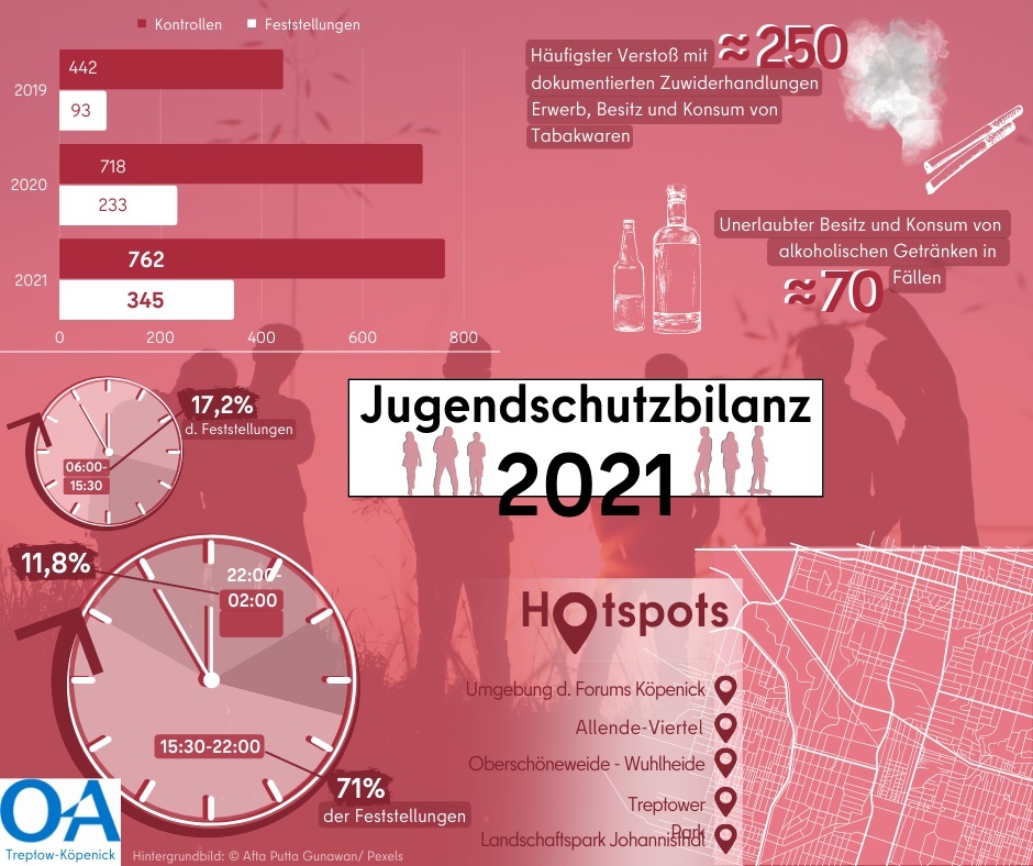 Fast 350 relevante Feststellungen bei insgesamt rund 760 kontrollierten Personen – das ist die Bilanz des Ordnungsamtes Treptow-Köpenick in Bezug auf seine 2021 durchgeführten Jugendschutzkontrollen. Damit erhöhte sich nicht nur die absolute Zahl der Verstöße gegen das Jugendschutzgesetz, auch im Verhältnis zu stattgefundenen Kontrollen mussten im vergangenen Jahr häufiger Feststellungen getätigt werden.