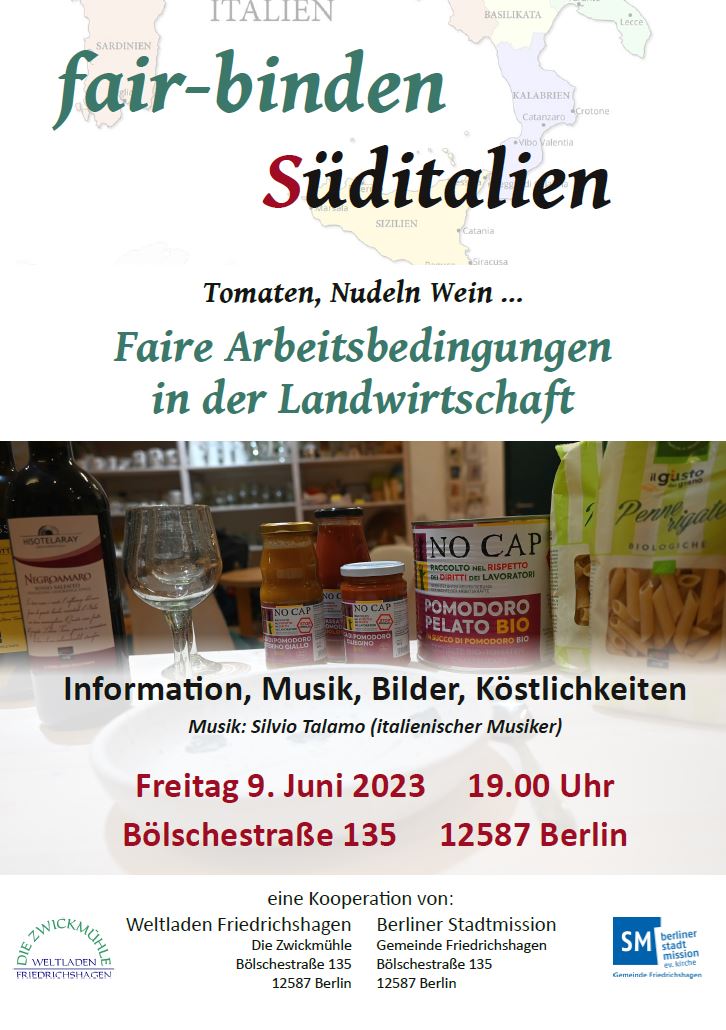 Am 9. Juni 2023 findet um 19 Uhr im Weltladen Friedrichshagen die Veranstaltung “fair-binden Süditalien” statt. Neben interessanten Informationen zu fairen Arbeitsbedingungen in der Landwirtschaft Süditaliens, Bildern und Köstlichkeiten wird die Veranstaltung von dem italienischen Musiker Silvio Talamo untermalt.
