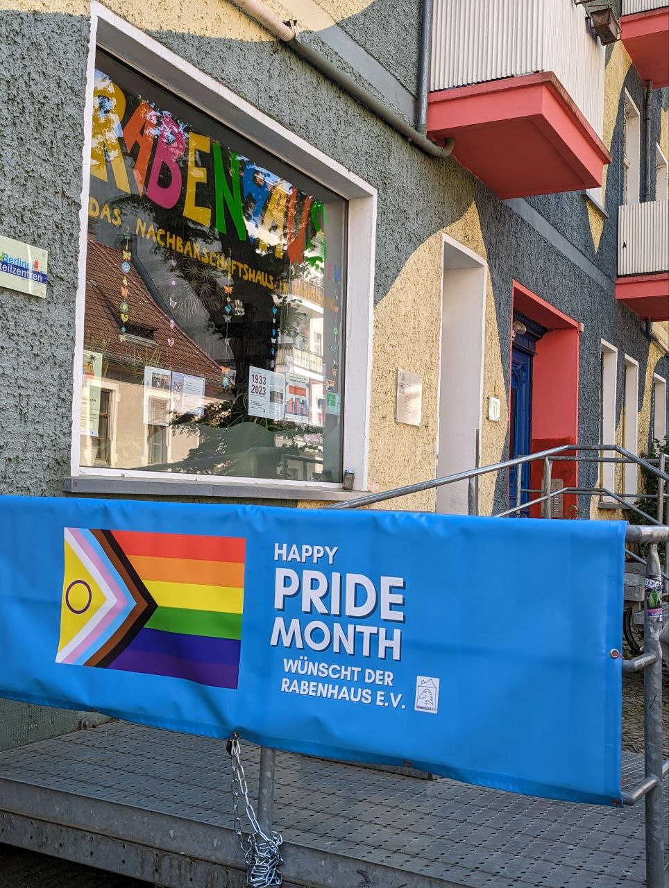 ##icon:flag_de## Das Nachbarschaftshaus Rabenhaus hat zum Beginn des Pride Month ein Banner am Eingang angebracht, auf dem es der Nachbarschaft einen gelungenen Pride Month wünscht. So soll ein starkes Zeichen der Solidarität und Sichtbarkeit im Kiez gesetzt werden. „Denn queere Nachbar*innen oder queere Menschen in unserem direkten Umfeld haben wir alle, auch wenn wir das oft gar nicht wissen. Leider erleben diese oft Beleidigungen und Hass, das dürfen wir als Gesellschaft nicht akzeptieren“, sagt eine Sozialarbeiterin des Rabenhaus e.V.