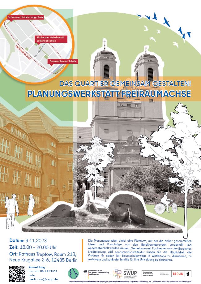 Am 9. November findet die nächste Runde zur Erarbeitung des Freiraumkonzepts Quartiersachse Baumschulenweg statt. Der Bezirk Treptow-Köpenick und das Planungsteam der SWUP GmbH laden alle interessierten Bürger*innen zur Planungswerkstatt “Freiraumachse Baumschulenweg” ein. Die Planungswerkstatt bietet eine Plattform, auf der die bisher gesammelten Ideen und Vorschläge aus den Beteiligungsrunden vorgestellt und weiterentwickelt werden können. Gemeinsam mit Fachleuten aus den Bereichen Stadtplanung und Landschaftsarchitektur haben Sie die Möglichkeit, die Visionen für diesen Teil Baumschulenwegs in Workshops zu diskutieren, zu verfeinern und konkrete Schritte für ihre Umsetzung zu definieren.
