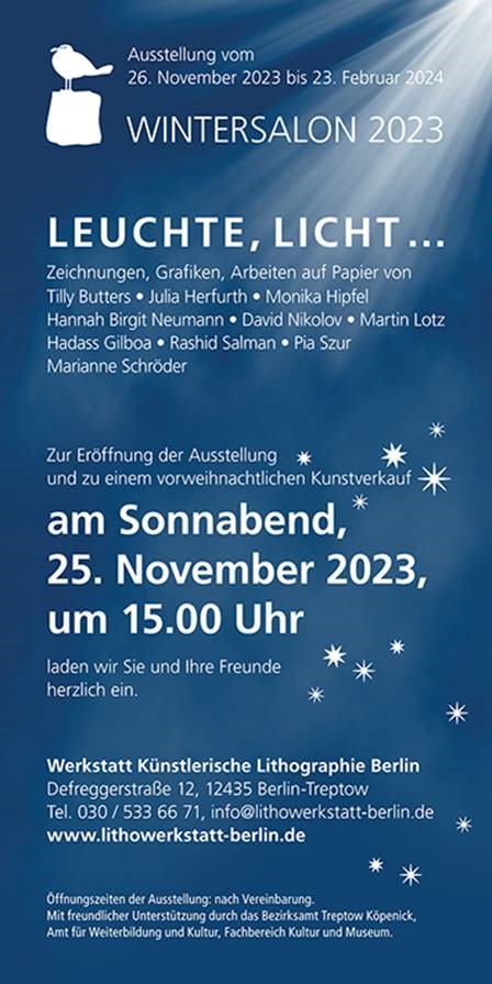 Zur Eröffnung der Ausstellung und zu einem vorweihnachtlichen Kunstverkauf lädt die Werkstatt Künstlerische Lithographie Berlin herzlich ein. Mit freundlicher Unterstützung durch das Bezirksamt Treptow Köpenick, Amt für Weiterbildung und Kultur, Fachbereich Kultur und Museum