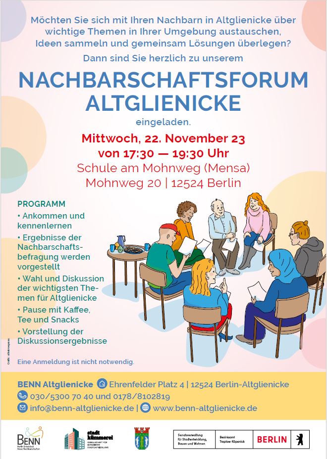 Das BENN-Team lädt die Altglienicker Nachbarschaft ein, gemeinsam über für sie relevante Themen in der Umgebung zu sprechen und Ideen und Lösungen zu überlegen. Alle sind herzlich eingeladen, sich an diesem Forum zu beteiligen.
