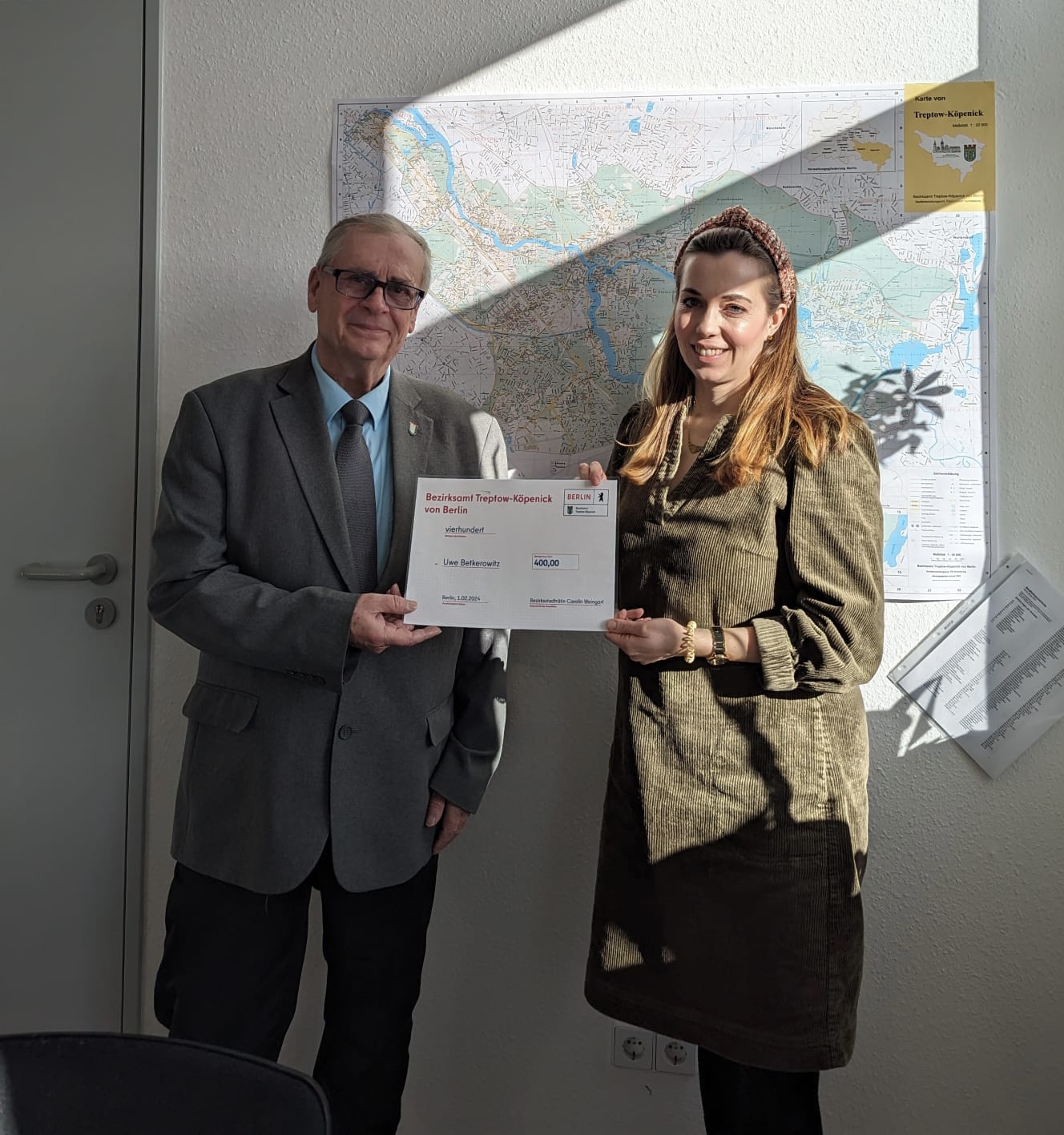 In der letzten Woche erhielt Herr Betkerowitz einen Zuwendungsbescheid über 400 Euro für eine neue Brille, die aus Mitteln der DKLB-Stiftung bewilligt werden konnten. Übergeben wurde der Scheck von Carolin Weingart, der Bezirksstadträtin für Soziales, Gesundheit, Arbeit und Teilhabe. „Ich freue mich, dass Herr Betkerowitz mit diesen Mitteln eine dringend benötigte neue Brille finanzieren konnte. Die Bedeutung solcher Hilfsprogramme, wie sie von der Stiftung DKLB angeboten werden, wird besonders für diejenigen deutlich, die dringend Unterstützung benötigen. Die enge Zusammenarbeit zwischen der Stiftung DKLB und dem Amt für Soziales gewährleistet eine gerechte Verteilung der Zuwendungsmittel an diejenigen, die es am dringendsten benötigen.“ so Carolin Weingart.