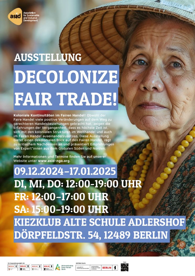 Ab Montag, den 9.12.2024 wird die Interview-Ausstellung „Decolonize Fair Trade“ im Kulturzentrum Alte Schule in Adlershof zu sehen sein.