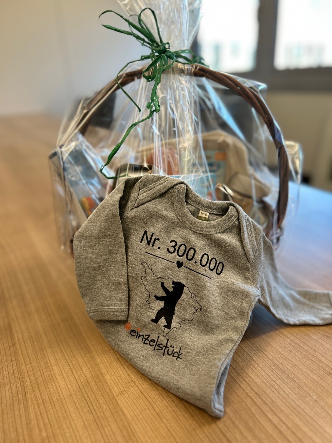 Nilo wurde im Februar 2025 geboren und wohnt mit seinen Eltern in Altglienicke. Als Zeichen der Anerkennung überreichte der Bezirksbürgermeister der Familie einen Präsentkorb, gefüllt mit hilfreichen Produkten für die junge Familie und einem besonderen Andenken: einem Baby-Body mit der Aufschrift „Nr. 300000“.