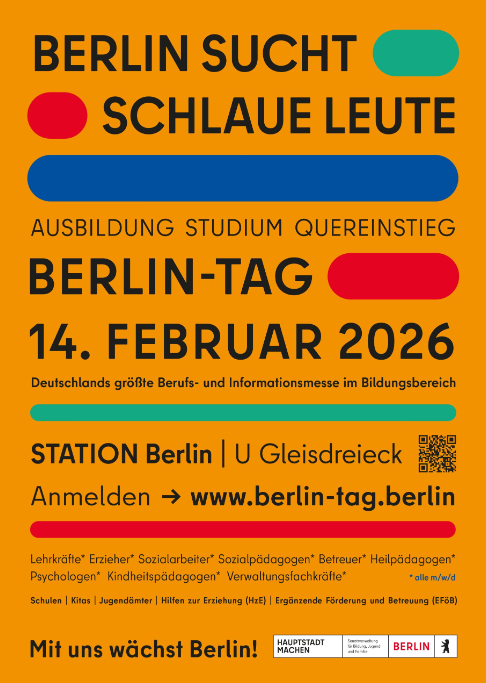Auf der Suche nach einem Beruf mit Sinn? Mit Perspektive? Mit direktem Kontakt zu Menschen? Dann besuchen Sie am 14. Februar 2026 den Berlin-Tag – die größte Berufsmesse für Bildung und Soziales in der Hauptstadt! Das Jugendamt Treptow-Köpenick ist mit einem eigenen Stand vertreten und zeigt, wie vielfältig, herausfordernd und erfüllend die Arbeit mit Kindern, Jugendli-chen und Familien sein kann.